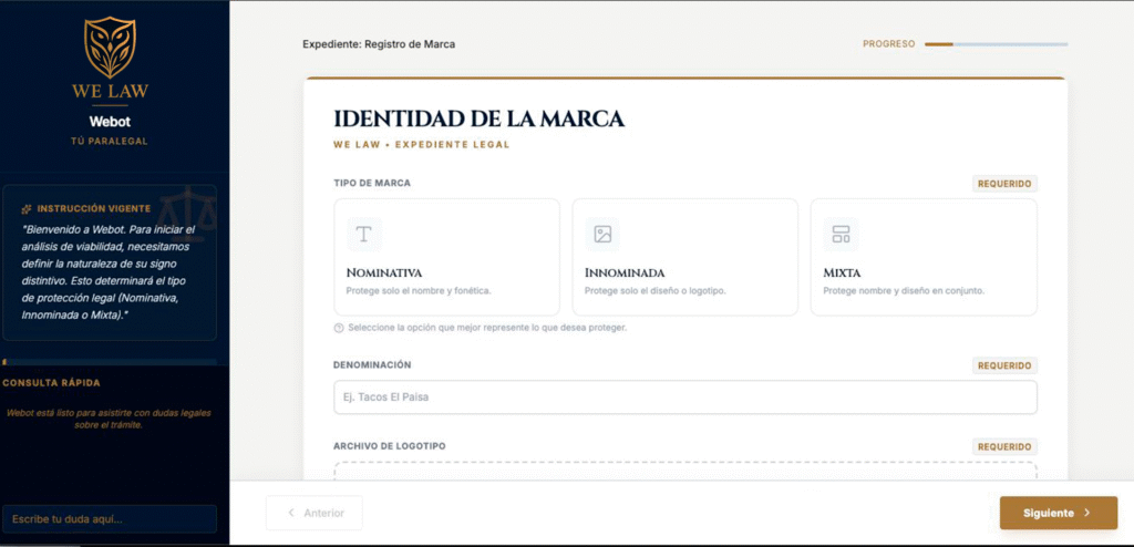 We Bot es tu Asistente para crear tu registro de marca lo más fácil posible. Se encarga de crear un análisis de viabilidad completo de tu marca, Consulta rápidamente las preguntas acerca del registro y delega el proceso a uno de nuestros Abogados para continuar con tu trámite.